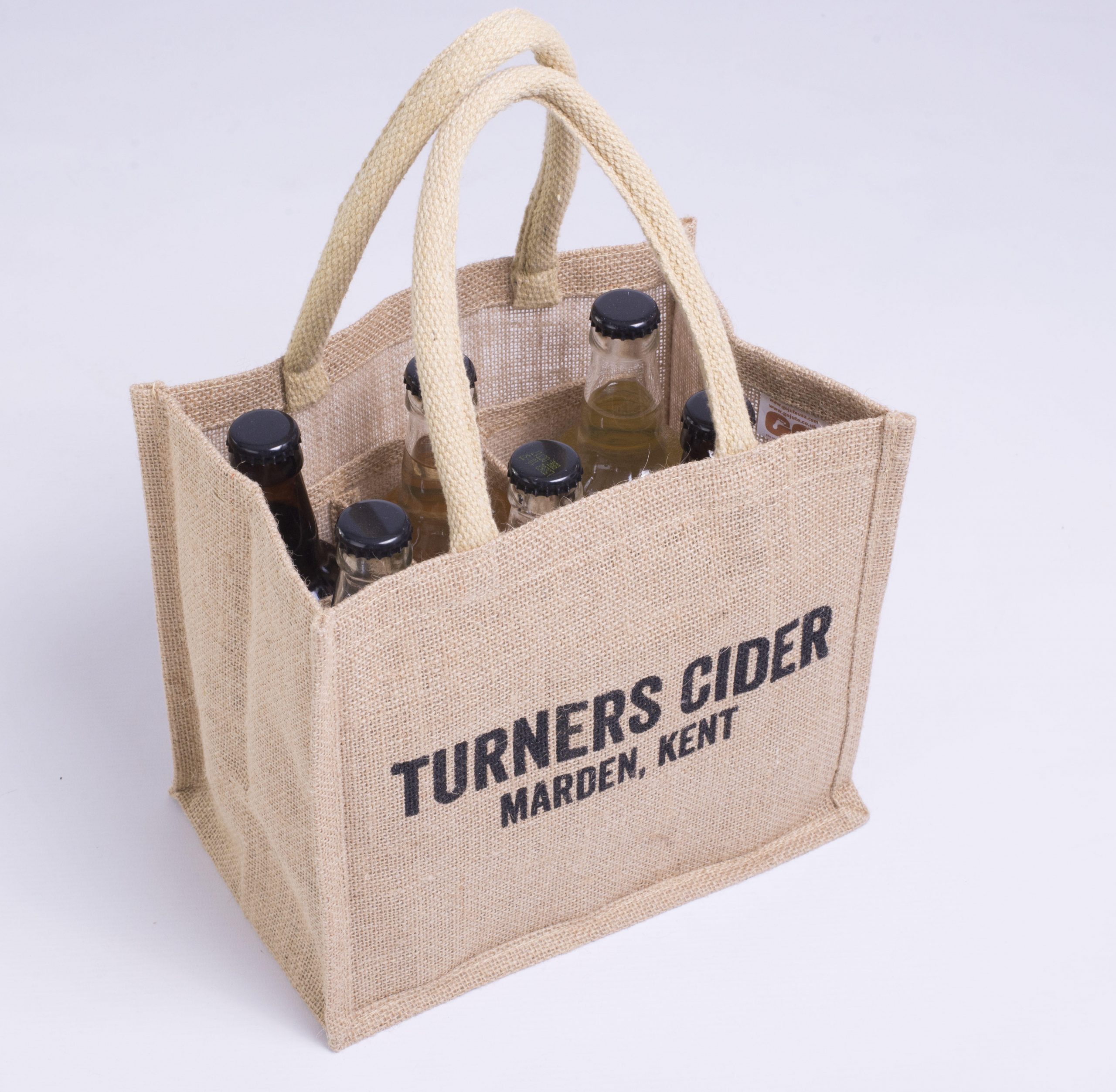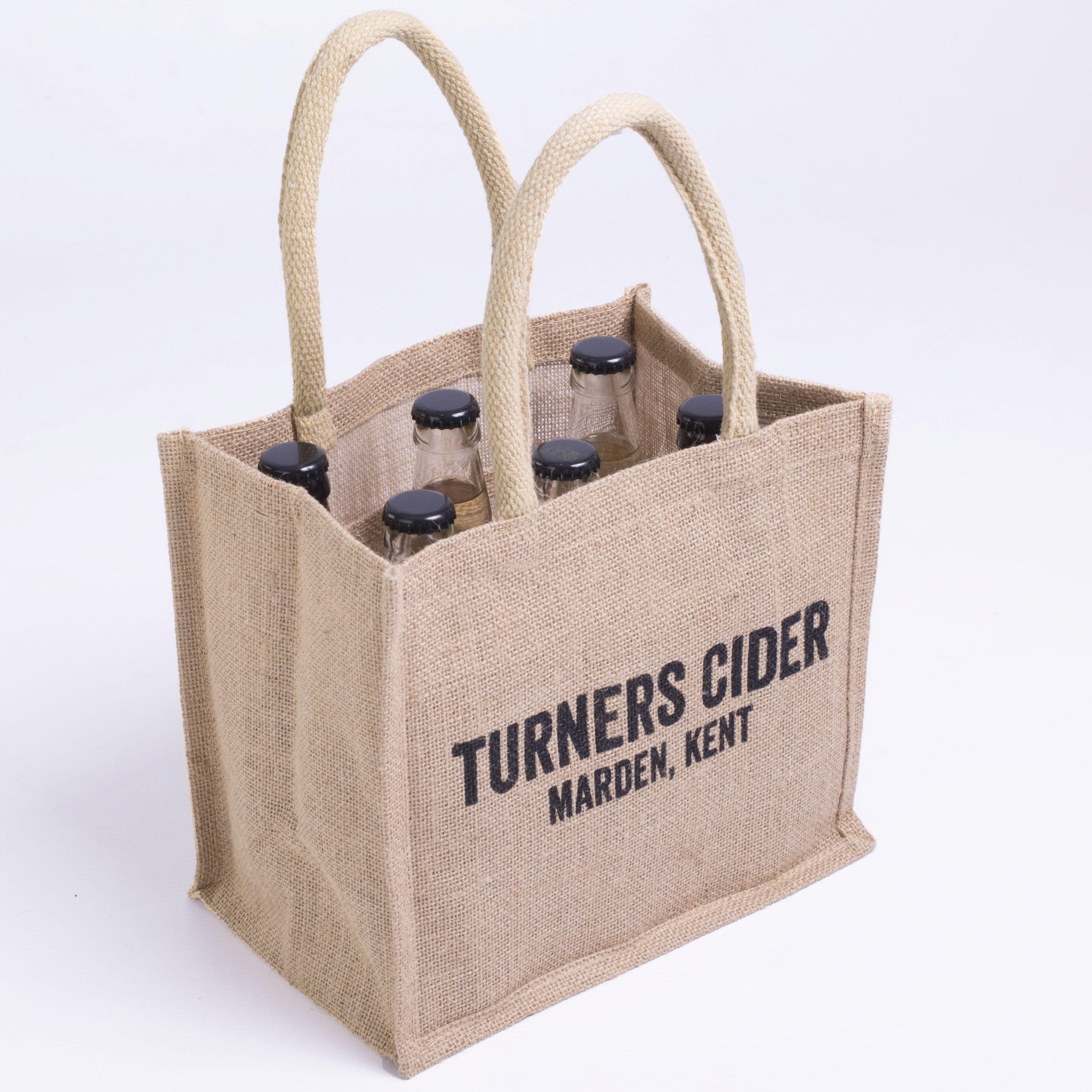 Neatly packaged in a re-usable branded Turners Cider jute bag with carry handle and internal dividers.